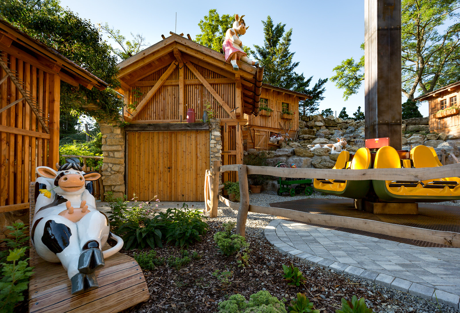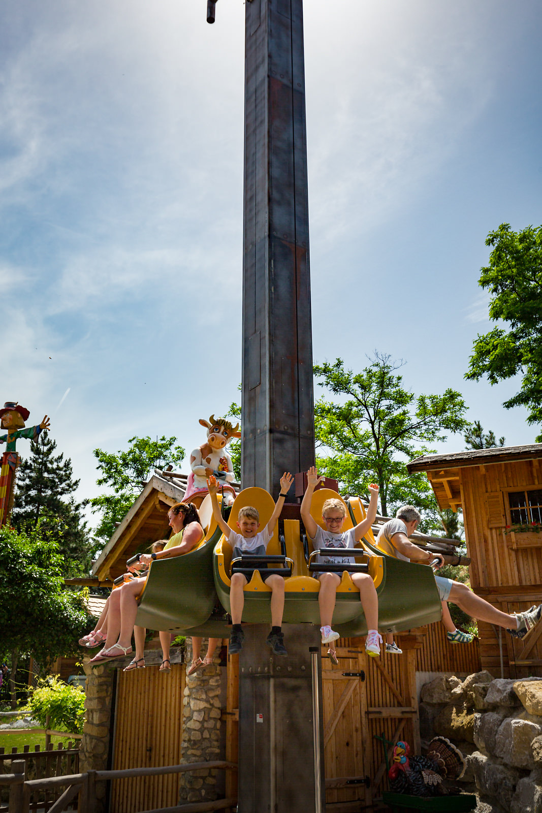 Besucht unser Bergdorf in der Themenwelt Bauernhof und beweist euren Mut bei einem der beiden Türme des Almjodler. Hier geht’s aus 8 Metern Höhe im freien Fall in die Tiefe. Das ist doch zum Jodeln!
