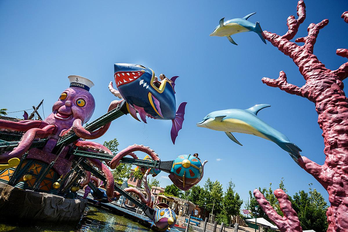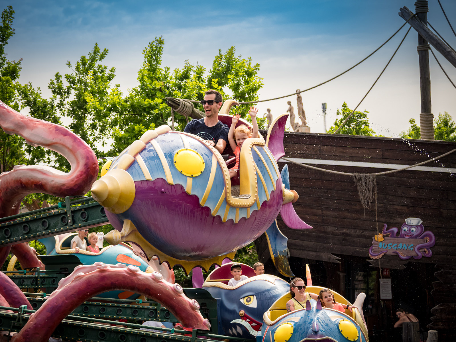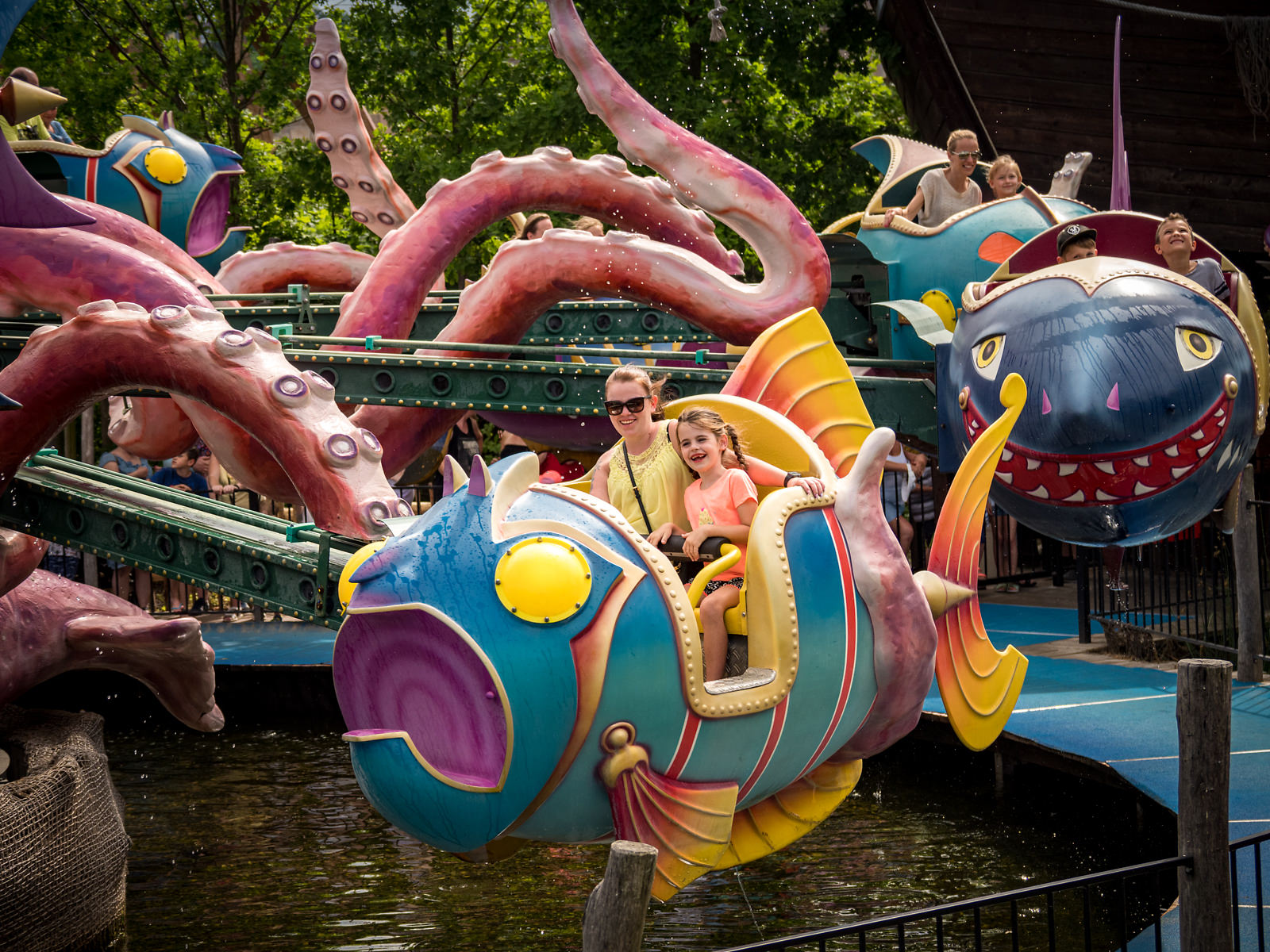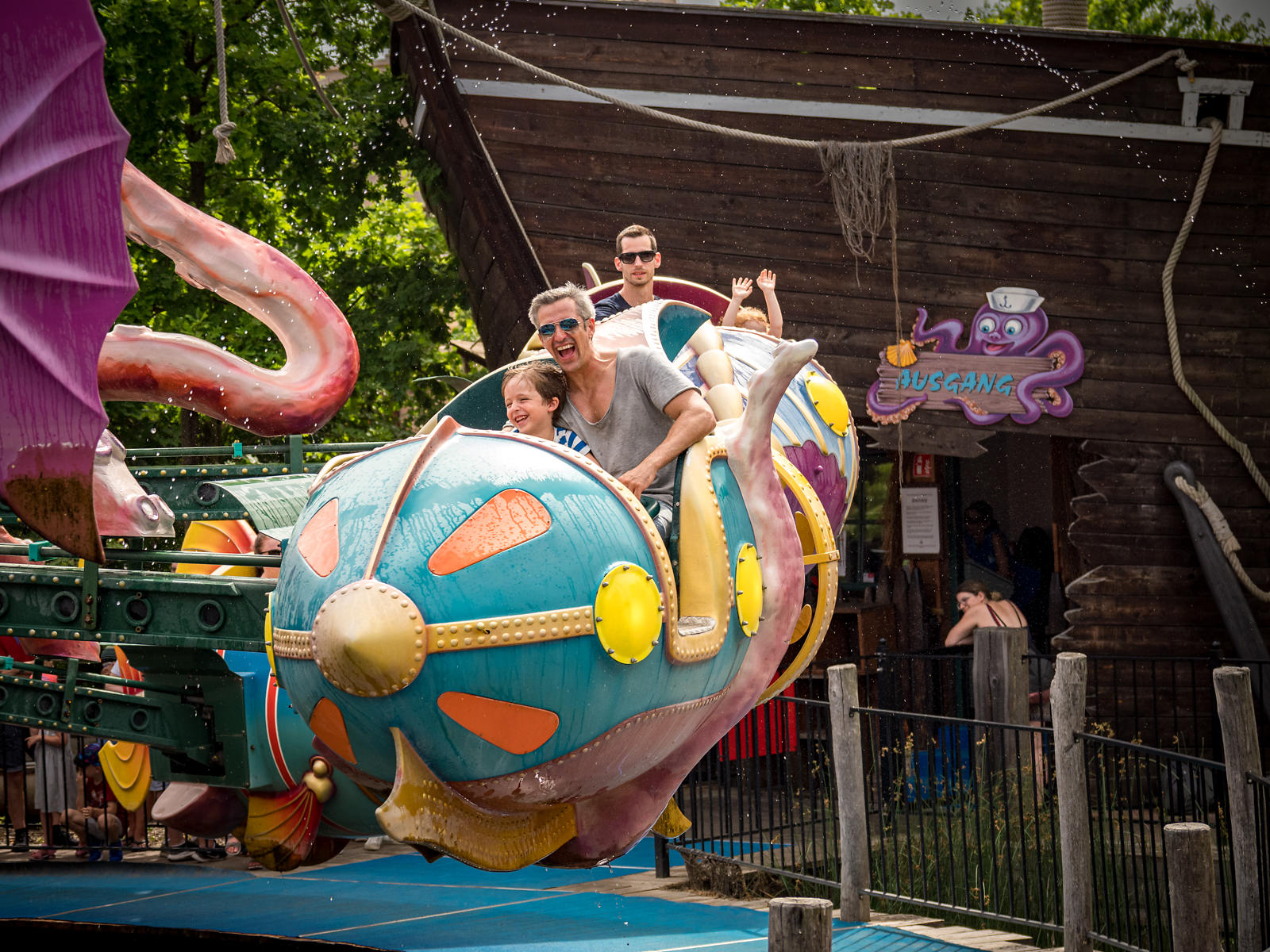 Nehmt Platz in einem der fliegenden Fische und dreht ein paar Runden mit der Riesenkrake. Mit einem Joystick könnt ihr euren Fisch individuell steuern und so den Wasserstrahlen ausweichen, die die anderen Meeresbewohner auf euch spritzen.