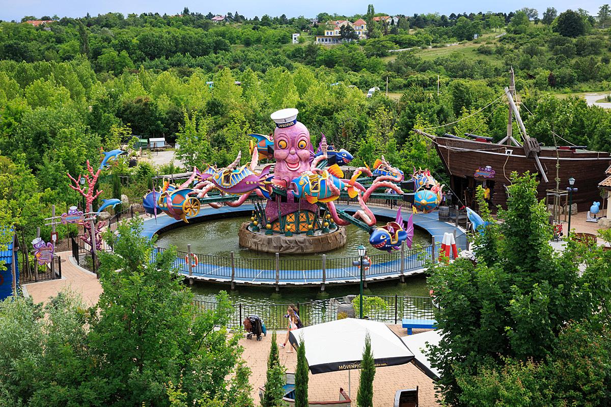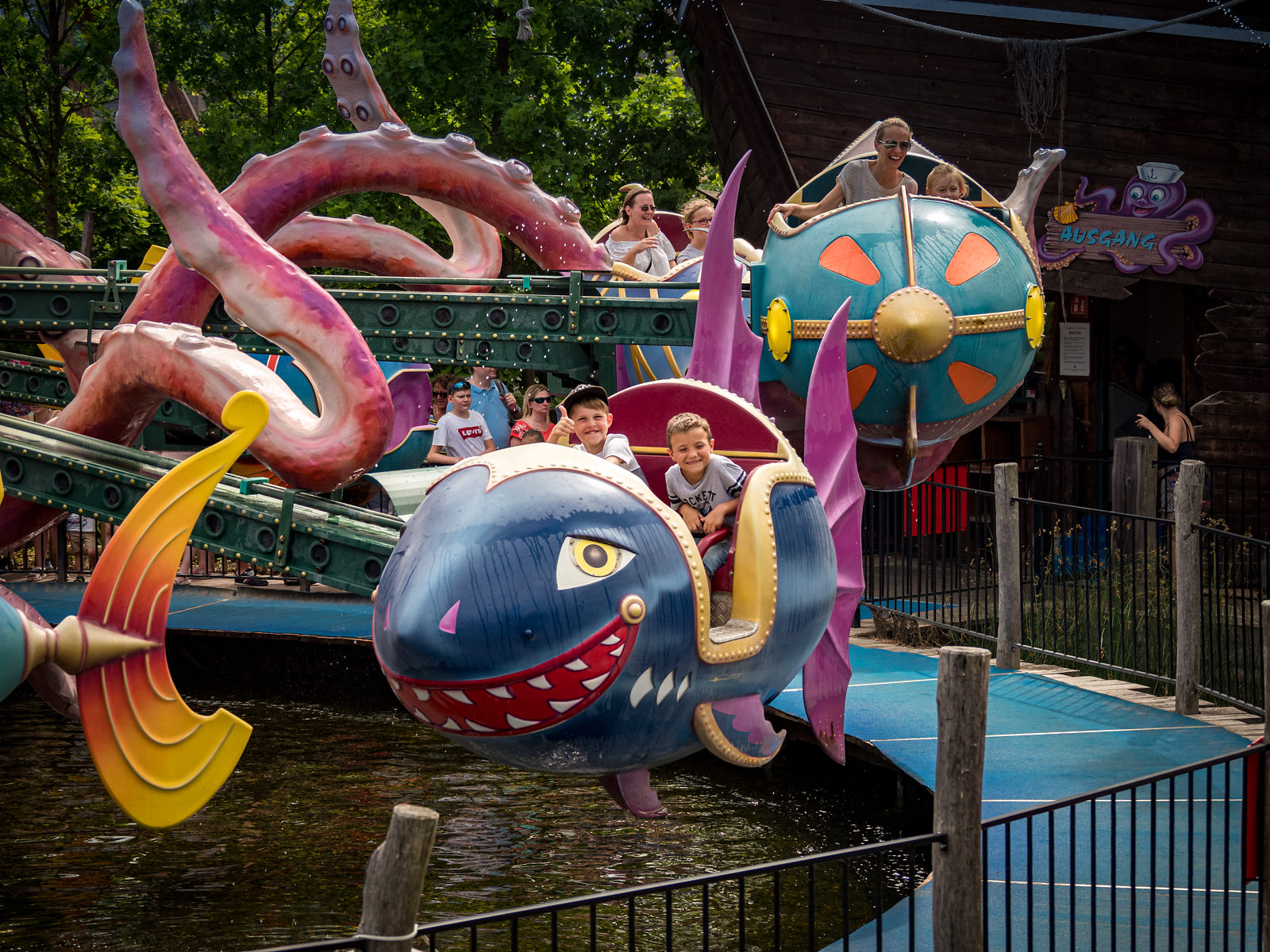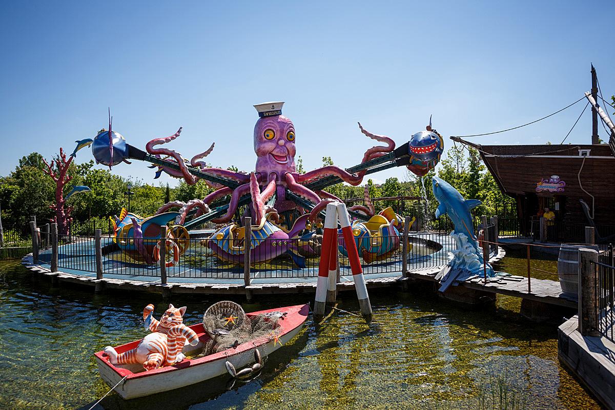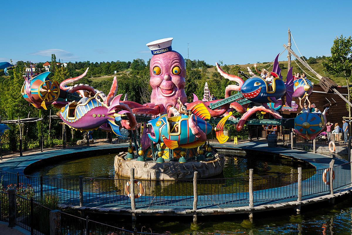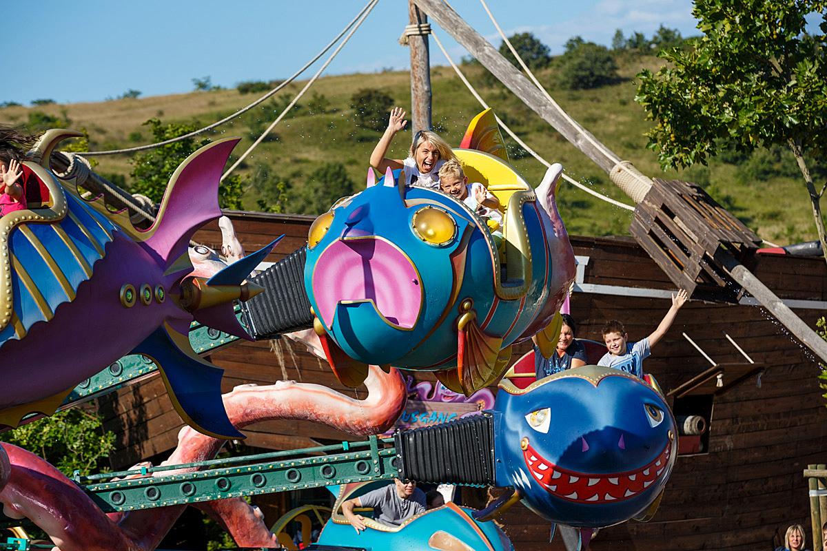 Nehmt Platz in einem der fliegenden Fische und dreht ein paar Runden mit der Riesenkrake. Mit einem Joystick könnt ihr euren Fisch individuell steuern und so den Wasserstrahlen ausweichen, die die anderen Meeresbewohner auf euch spritzen.