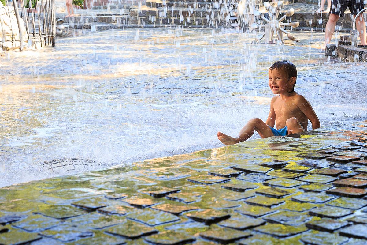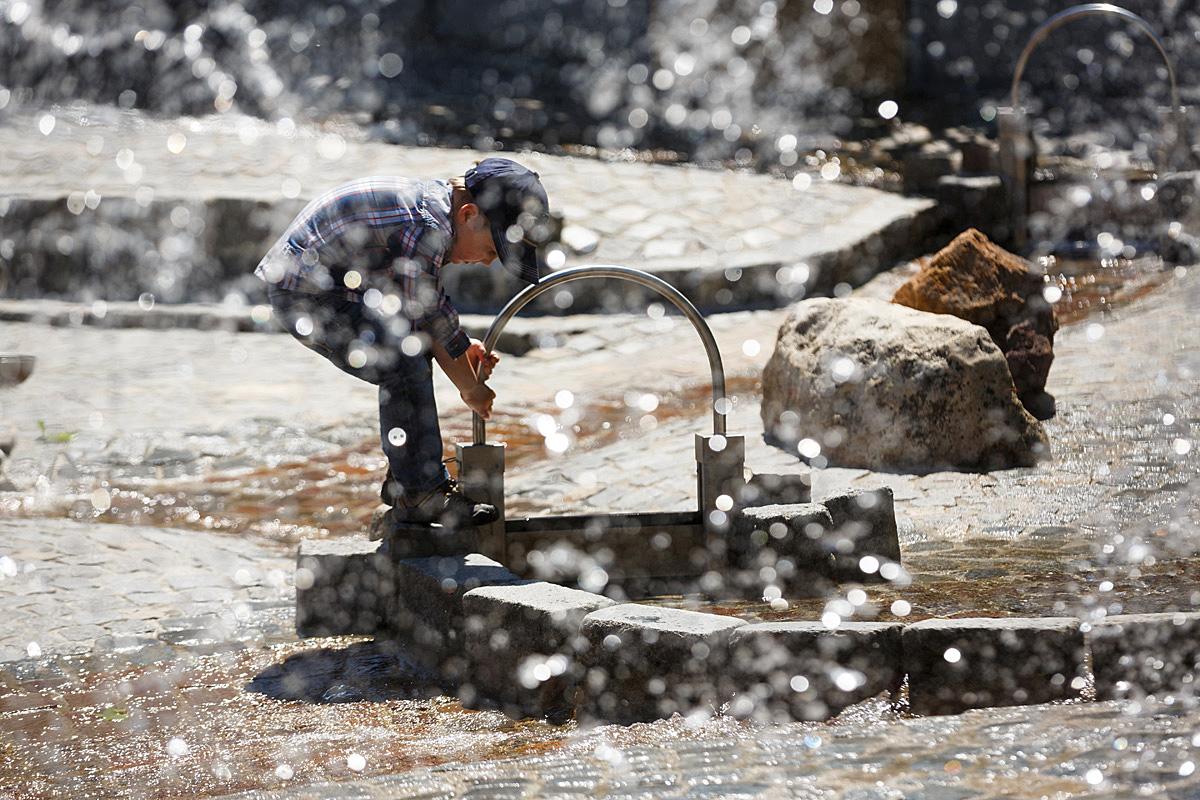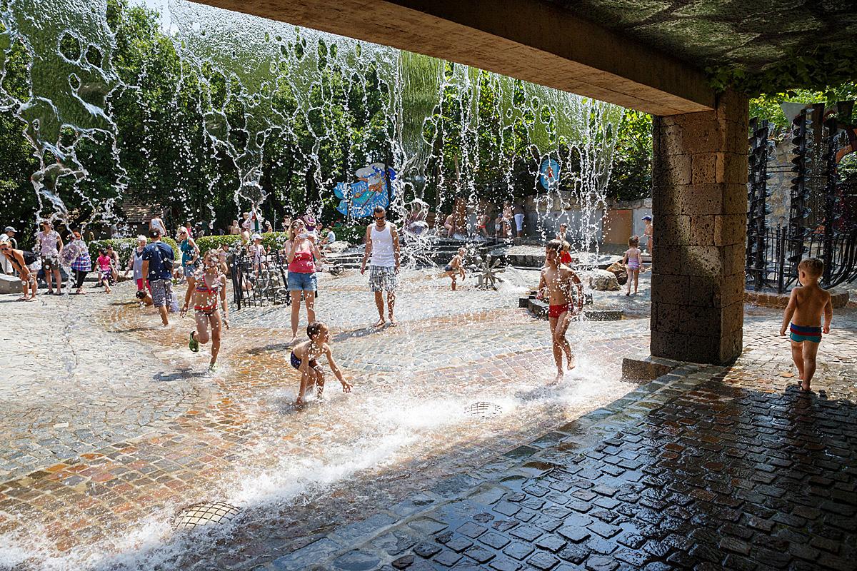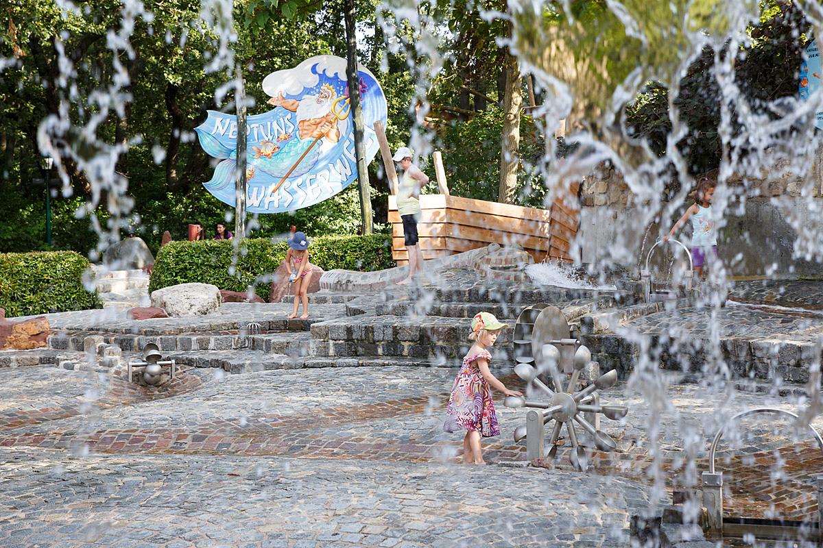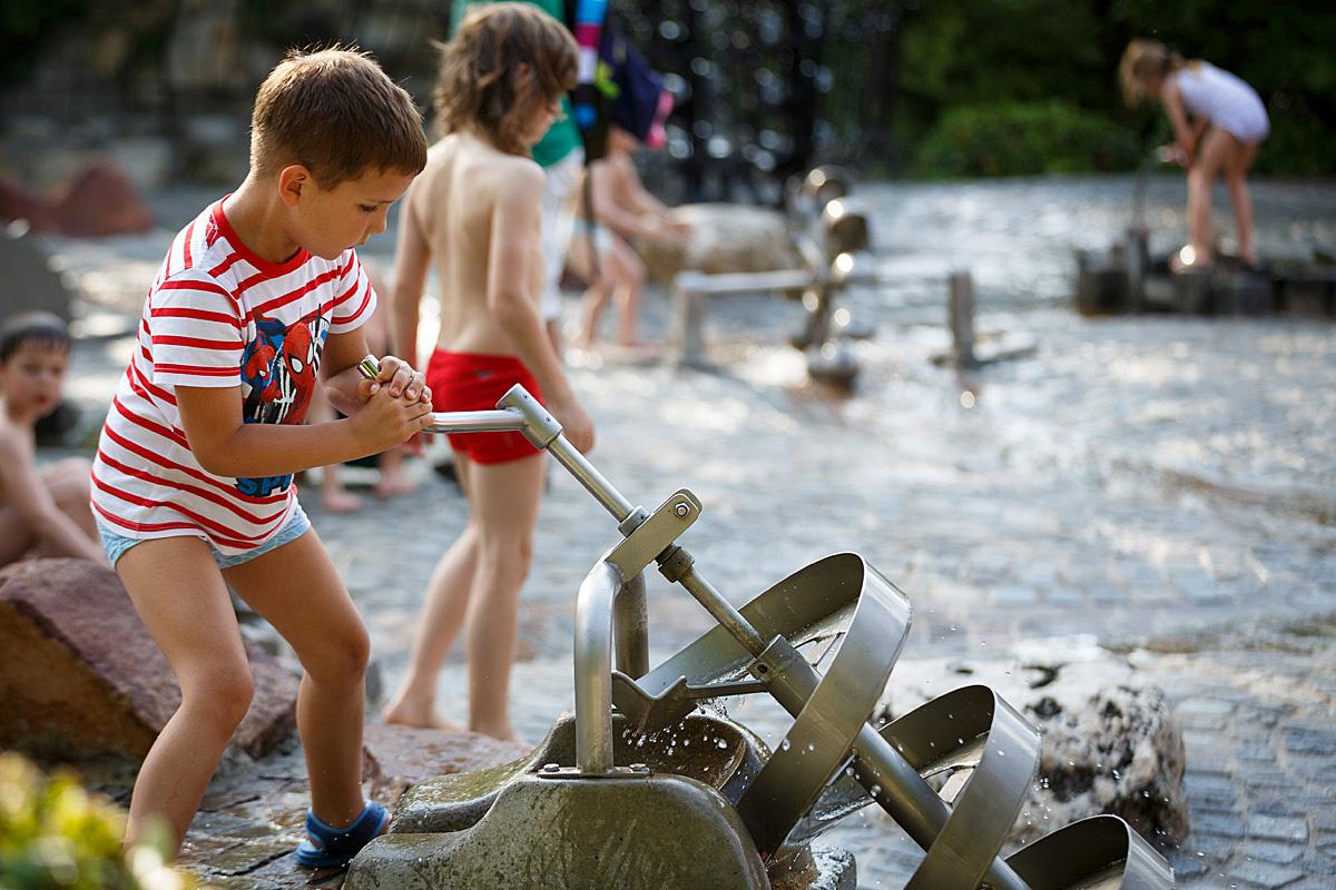 Ein absoluter Hotspot an heißen Sommertagen ist unser Wasser-Erlebnisspielplatz. Hier könnt ihr nach Herzenslust im frischen Fließwasser unserer Bachläufe plantschen. Mit der archimedischen Schraube befördert ihr das kühle Nass eine Etage höher und mit den Sperren leitet ihr die Wasserwege um. Wer sich so richtig abkühlen möchte, stellt sich einfach unter den großen Wasserfall.