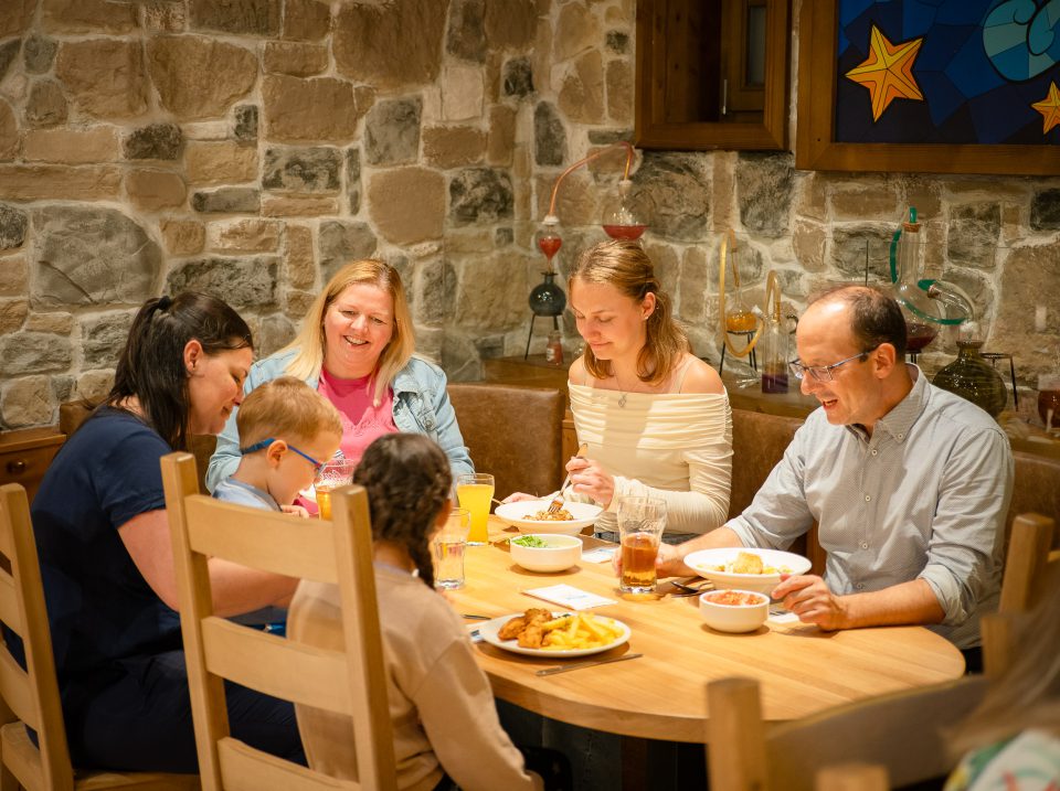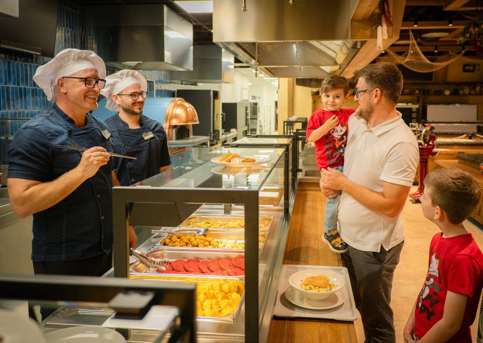In the unique atmosphere of our medieval setting, you’ll experience entirely new culinary delights. In the open show kitchen, you can watch our chefs live as they prepare a diverse selection of dishes – from the wok to the pizza oven to the rotisserie, everything is included. Vegetarians and vegans are also well taken care of. A fully stocked cake display, hearty snacks for a quick bite, and many other delicacies invite you to indulge.