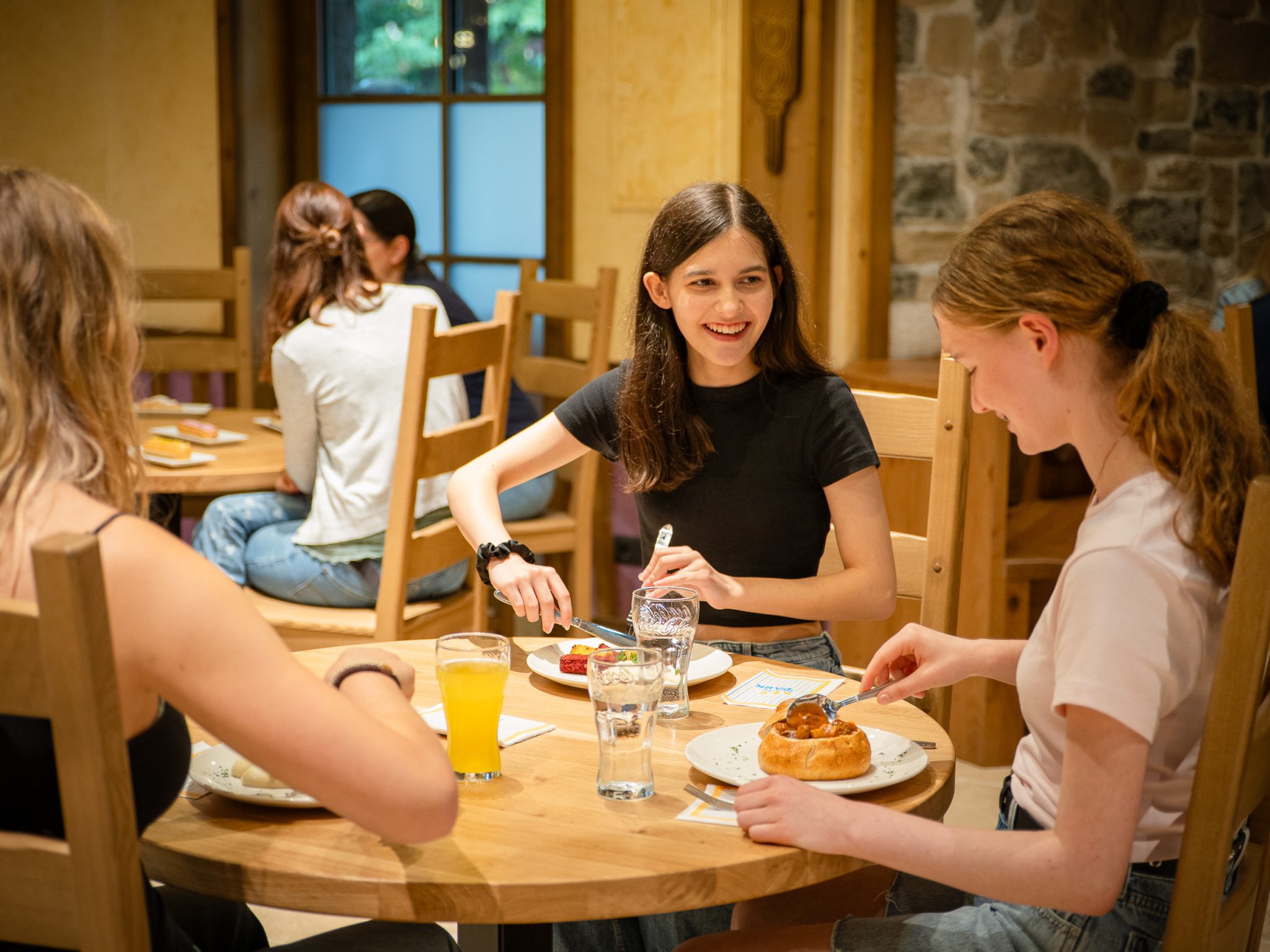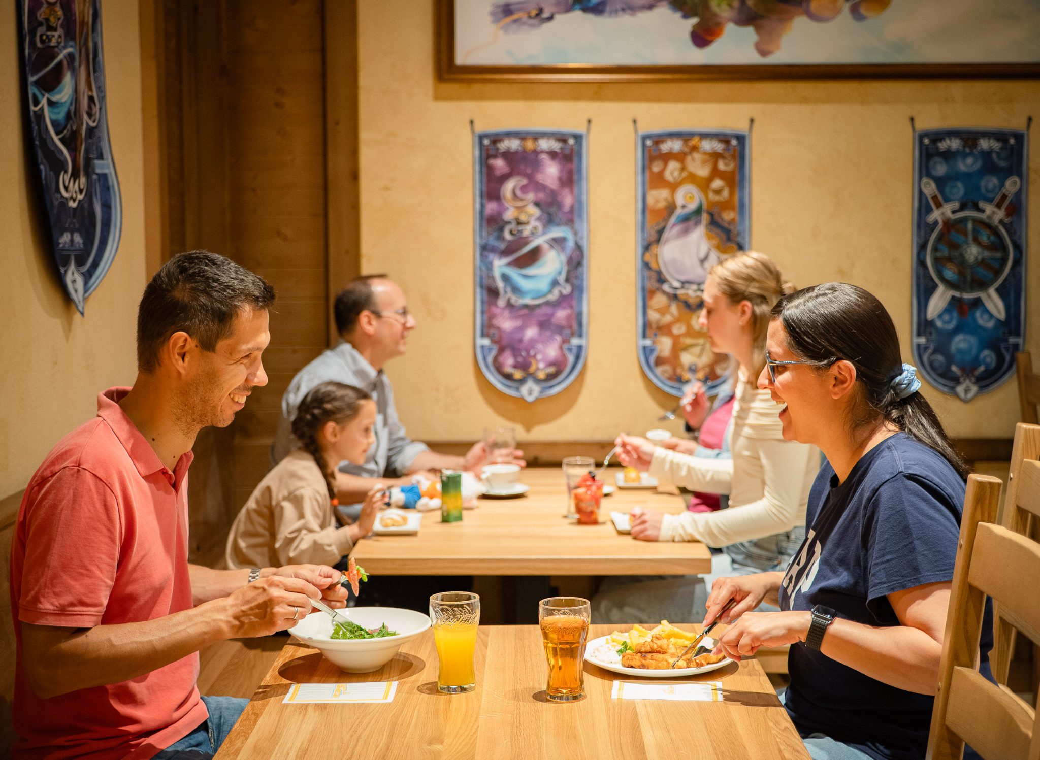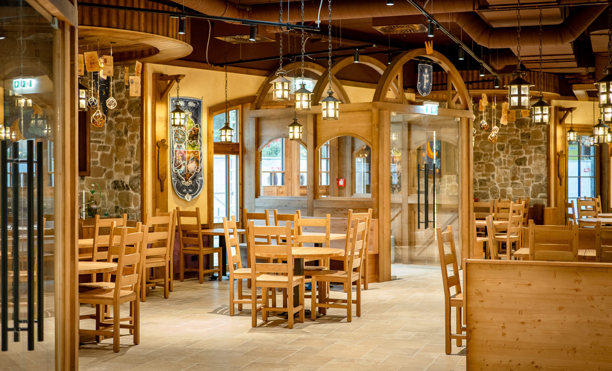 Egy középkori környezetben teljesen új ízélmények várnak rátok. A nyitott látványkonyhában élőben figyelhetitek szakácsainkat, amint változatos ételeket készítenek – a woktól kezdve a pizzasütő kemencén át egészen a grillforgatóig minden megtalálható. A vegetáriánus vagy vegán étrendet követők számára is bőséges kínálat áll rendelkezésre. Ezenkívül gazdagon megrakott süteményes vitrin, kiadós harapnivalók két étkezés között és sok egyéb finomság is vár a vendégekre.