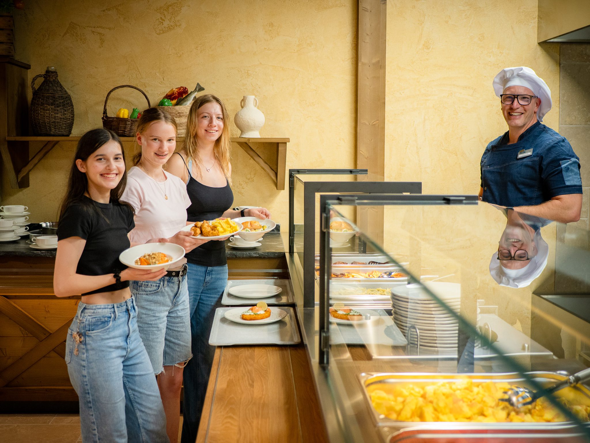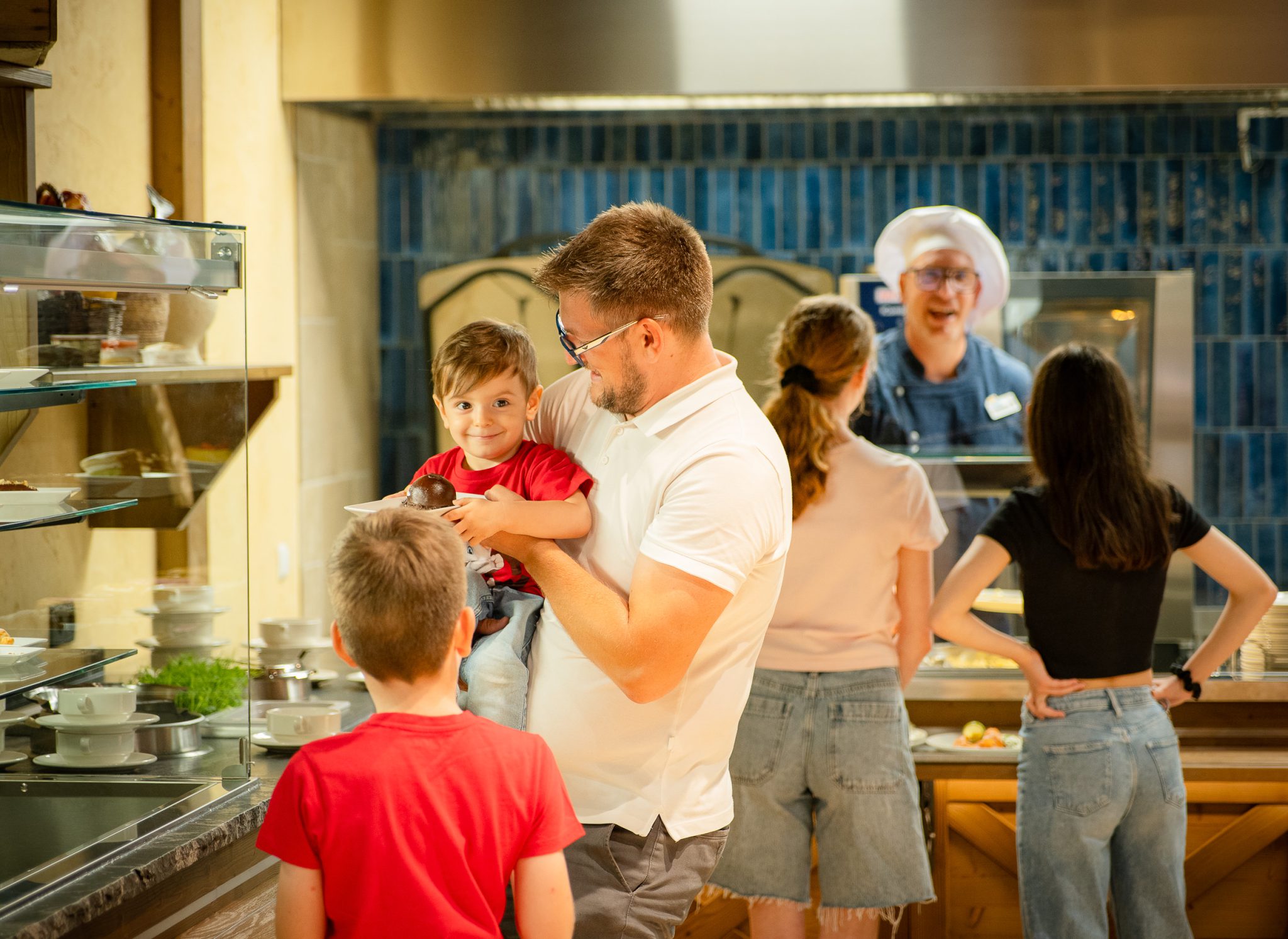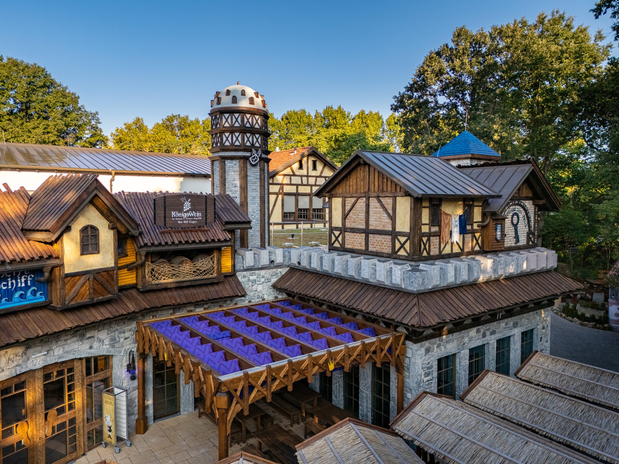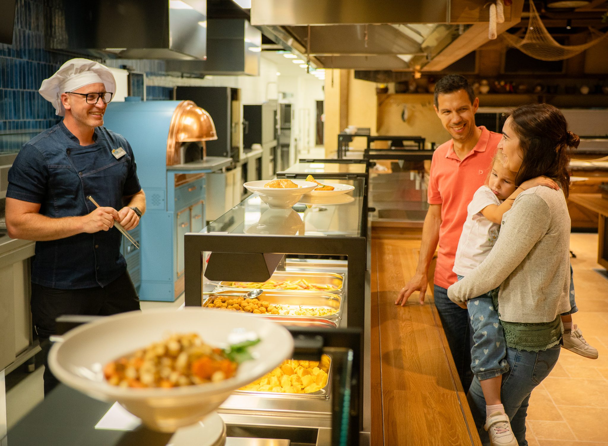 Egy középkori környezetben teljesen új ízélmények várnak rátok. A nyitott látványkonyhában élőben figyelhetitek szakácsainkat, amint változatos ételeket készítenek – a woktól kezdve a pizzasütő kemencén át egészen a grillforgatóig minden megtalálható. A vegetáriánus vagy vegán étrendet követők számára is bőséges kínálat áll rendelkezésre. Ezenkívül gazdagon megrakott süteményes vitrin, kiadós harapnivalók két étkezés között és sok egyéb finomság is vár a vendégekre.